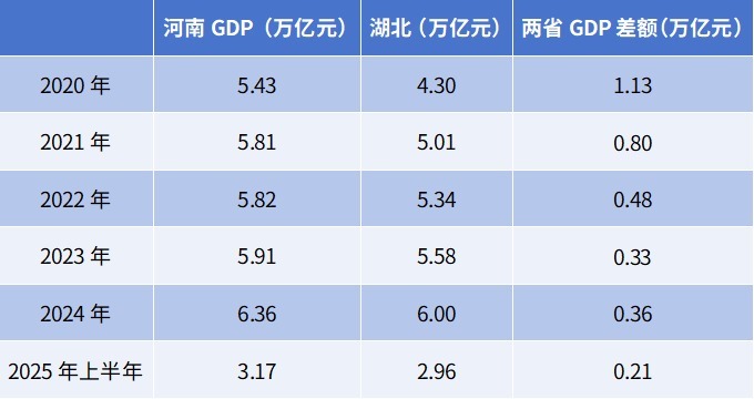 截至2025年6月,湖北与河南的GDP差距只有2000亿元了,而从2020年到2024年,湖北已经追了超7000亿元。